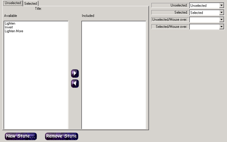 Bindings provide a mechanism for telling the layout which states correspond to the states it understands (the states it understands are the same as the default set of states, i.e. Unselected, Unselected Mouse Over, Selected and Selected Mouse Over). By default, the bindings are set so that each layout state corresponds to the appropriate button state. You can change these bindings using the drop down list boxes at the right of the Button States and Bindings tab.