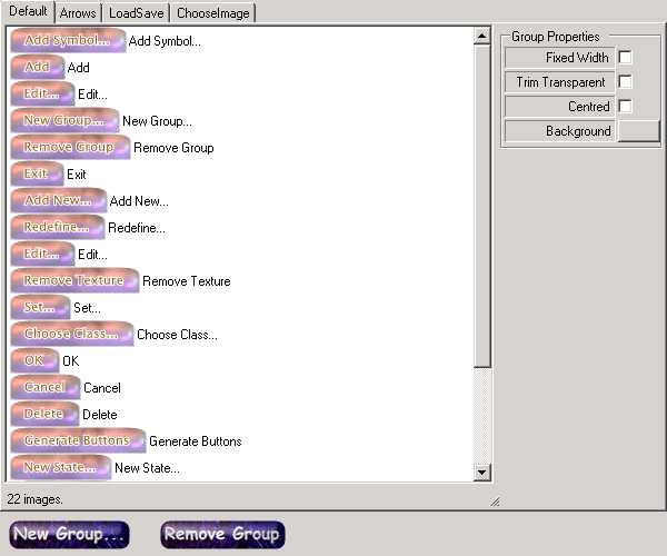 Button It! - Introduction Button It! - Button States and Bindings Button It! - Button Groups Button It! - Defining Styles Button It! - Layout Button It! - Registration Button It! - Saving Images Button It! - Style Presets Button It! - Support Button It! - Swapping Presets Button It! - Symbol Selector Button It! - Variations Button GroupsA button group, as you might have guessed, defines a group of buttons. For example you might have a group of buttons contain the text 'Home', 'About Us', 'Products', 'Contact Us', and 'Further Information'. Creating and Removing GroupsBy default, a project contains a single button group, named 'Default'. This group cannot be removed. You can add additional groups using the 'New Group' button, or remove them using the 'Remove Group' button. No two groups can have the same name, and there must always be a 'Default' group.