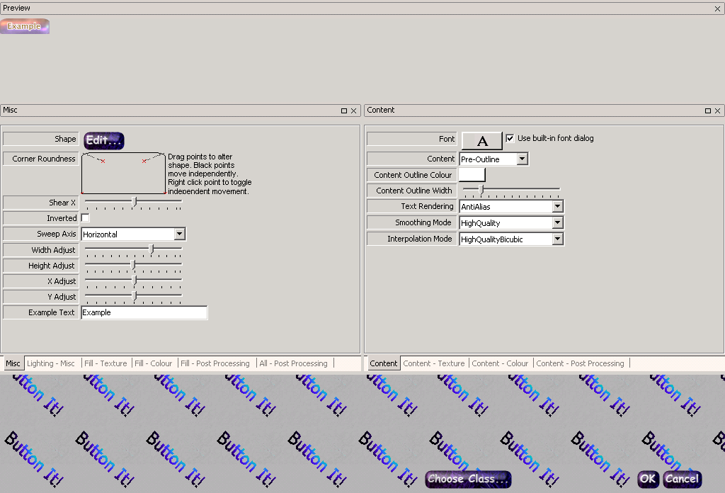 On pressing the edit button for the style, you are presented with the 'Style Editor' dialog, Editor' dialog, shown here: Style ClassesThe most important thing about a style is it's 'class'. This determines the general 'engine' that will be used for rendering. Different classes will have different different sets of parameters that indicate to the engine precisely how the button should be drawn. Some of these parameters are shared by all of the engines, some are shared between a subset of the engines, and some are unique to a single engine. To choose the button class, you click on the 'Choose Class...' button in the Style Editor. You are then presented with a list of the available classes, and a graphical depiction of a button rendered by each class. When choosing a class in this manner, you have the option of retaining whatever settings overlap between the old class and the new class. As an example, imagine if you have a style of class 'bevelled' with the colour set to orange, and you choose a new class of 'metallic'. Because 'metallic' also has a colour setting, if you check the 'retain previous settings' box, the new style will also have the colour set to 'orange'. Otherwise, the colour will be set to a default value that is determined by the metallic style (which is blue). Style SettingsHaving chosen the class, the 'Style Editor' is updated to reflect the settings that are available to the class. The Docking Window InterfaceThe settings are organised in groups that can be dragged to dock within each other (resulting in a 'tabbed' group, as shown in the figure above). They can also be dragged to 'float' within the style editor. To drag a 'lone' group or a complete tabbed group, click on the title bar of the group and drag it to the desired location; visual clues will be provided to help you determine where it will end up if you drop it in a particular place. To drag a single group within a tabbed group, drag the tab corresponding to the sub-group you want to drag. Right clicking the title bar of a group present a menu which allows you to hide or show groups as required. If you don't like the default layout of the properties, you can also save your preferred layout from this menu. A different layout can be saved for each button class; this will be the layout that will be loaded by default for that class in future. The default layout for each class generally contains settings related to the 'content' (i.e. the text or symbol within the button) in a docked tabbed group on the right, other aspects of the style in a docked tabbed group on the left, and one last group for the preview image, docked at the top. Most of the settings themselves should be reasonably self-explanatory. If in doubt, experiment! |